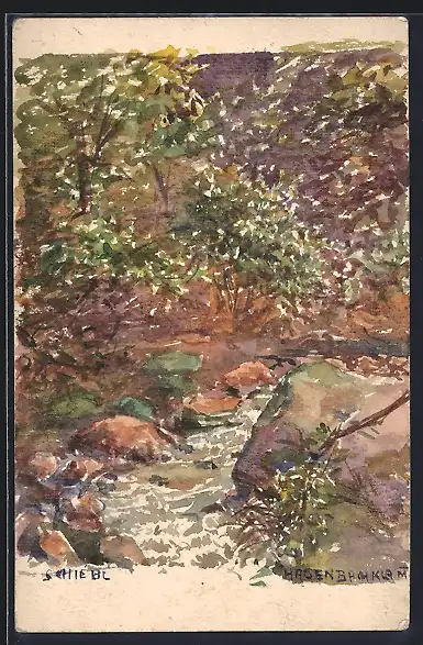 Künstler-AK Handgemalt sign. Andreas Schiebler: St. Andrä-Wördern, Hagenbachklamm, Partie am Fluss