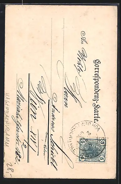 Personenbezogene Daten auf der Rückseite der Karte wurden durch blauen Textmarker unkenntlich gemacht. Die blauen Stellen sind auf die Vorderseite durchgeweicht und wirken sich negativ auf das Postkartenfoto aus