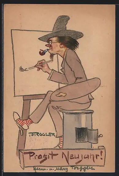 Künstler-AK Handgemalt sign. Torggler: Künstler sitzt mit Pinsel an seiner Staffelei