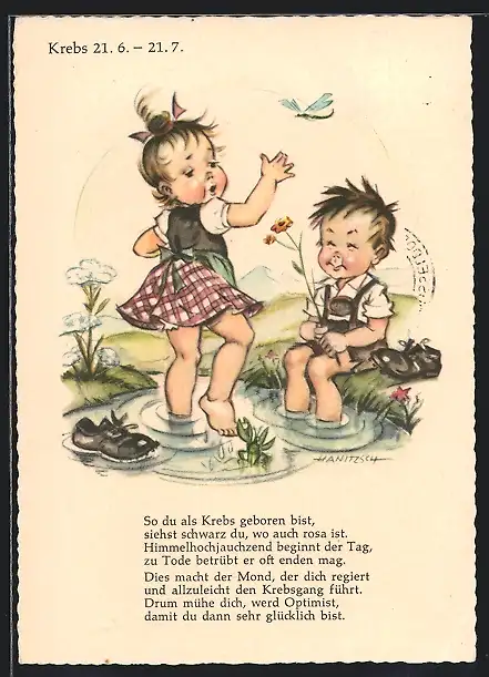 Künstler-AK Hanitzsch: Sternzeichen Krebs, Krebs kneift einem Mädchen in den Fuss