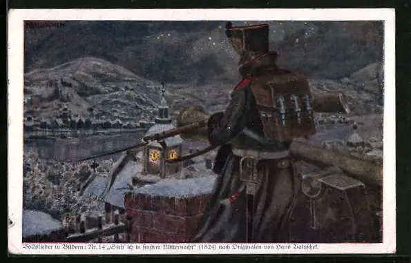 Künstler-AK Hans Baluschek: Soldat steht in finsterer Mitternacht