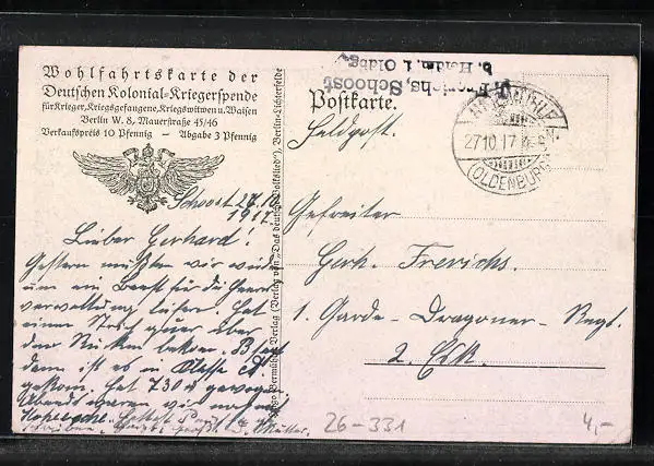 alte Ansichtskarte, gelaufen 1917 als Feldpost, Eckknicke unten, guter Zustand