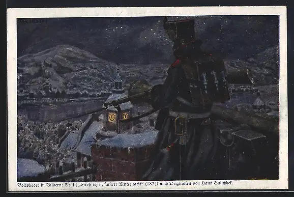 Künstler-AK Hans Baluschek: Soldat steht in finsterer Mitternacht
