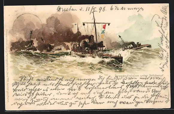 Künstler-AK Hans Bohrdt: Torpedodivision unter Volldampf, Kriegsschiff in Fahrt