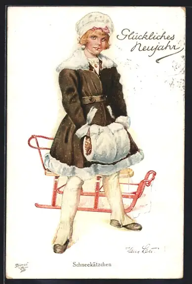 Künstler-AK Hans Leu: Schneekätzchen in Winterkleidung mit Schlitten