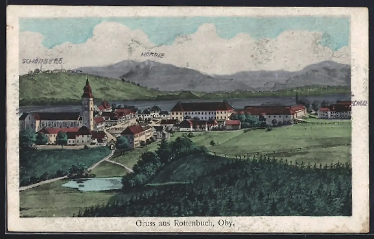 Künstler-AK Hans Pernat: Rottenbuch / Obb., Ortsansicht mit Schönberg