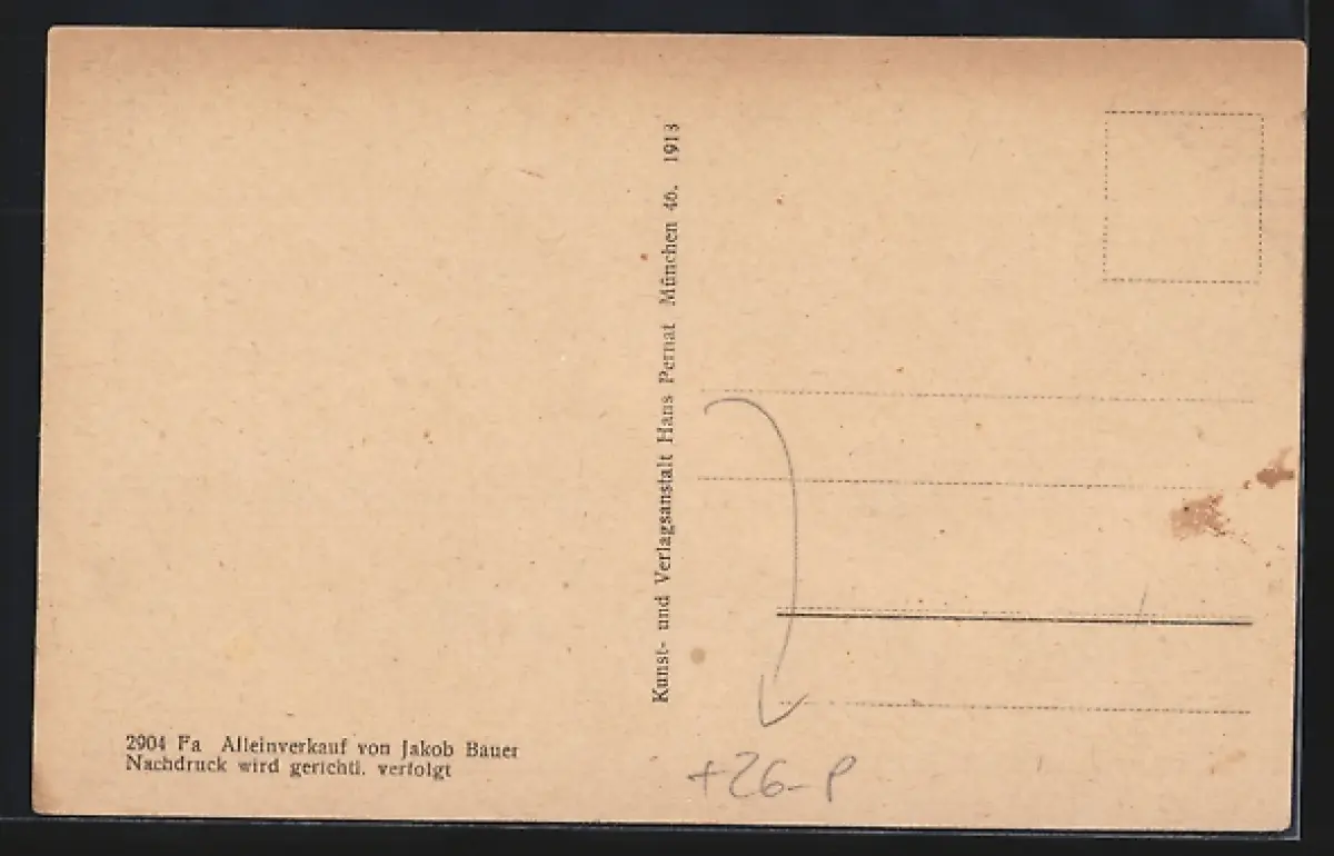 Personenbezogene Daten auf der Rückseite der Karte wurden durch blauen Textmarker unkenntlich gemacht. Die blauen Stellen sind auf die Vorderseite durchgeweicht und wirken sich negativ auf das Postkartenfoto aus