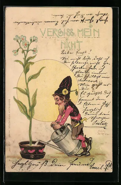 Künstler-AK Hans Starcke: Zwerg giesst ein Vergissmeinnicht