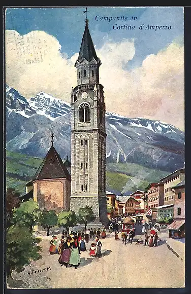 Künstler-AK Hans Treiber: Cortina d`Ampezzo, Ortspartie mit Kirche