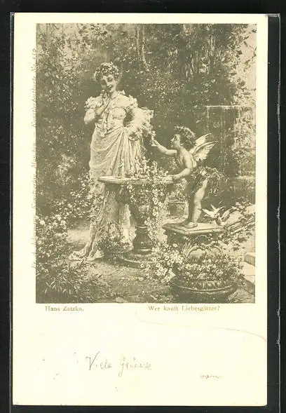 Künstler-AK Hans Zatzka: Amor zeigt Frau Figuren auf Tisch