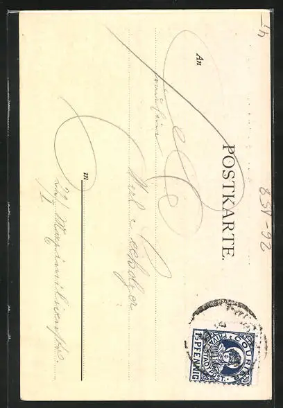 Personenbezogene Daten auf der Rückseite der Karte wurden durch blauen Textmarker unkenntlich gemacht. Die blauen Stellen sind auf die Vorderseite durchgeweicht und wirken sich negativ auf das Postkartenfoto aus