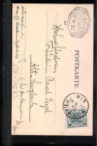 Personenbezogene Daten auf der Rückseite der Karte wurden durch blauen Textmarker unkenntlich gemacht. Die blauen Stellen sind auf die Vorderseite durchgeweicht und wirken sich negativ auf das Postkartenfoto aus