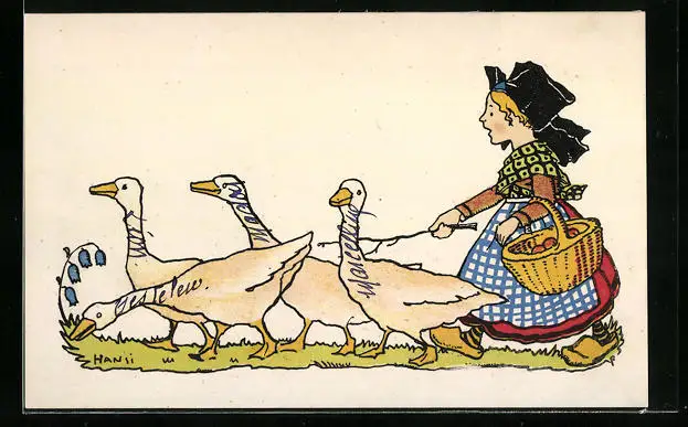 Künstler-AK Hansi: Mädchen in Volkstracht mit ihren Gänsen