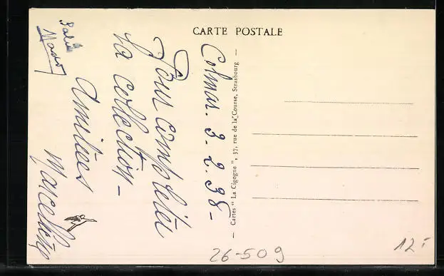 Personenbezogene Daten auf der Rückseite der Karte wurden durch blauen Textmarker unkenntlich gemacht. Die blauen Stellen sind auf die Vorderseite durchgeweicht und wirken sich negativ auf das Postkartenfoto aus