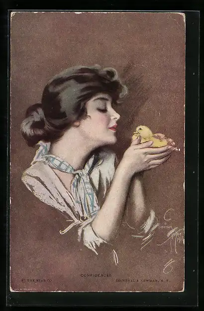 Künstler-AK Harrison Fisher: Confidences, Fräulein mit Entenküken