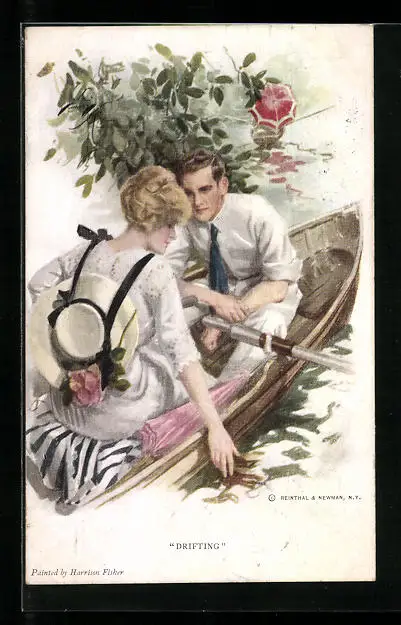 Künstler-AK Harrison Fisher: Drifting, Herr und Dame im Boot