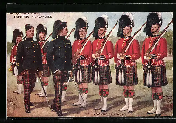 Künstler-AK Harry Payne: The Queen`s own Cameron Highlanders, Mounting Guard, schottische Garde