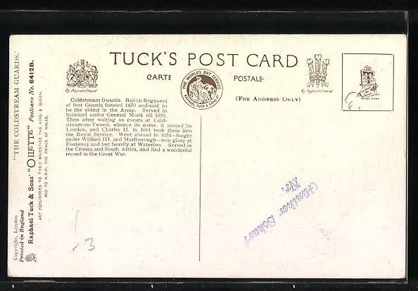 Personenbezogene Daten auf der Rückseite der Karte wurden durch blauen Textmarker unkenntlich gemacht. Die blauen Stellen sind auf die Vorderseite durchgeweicht und wirken sich negativ auf das Postkartenfoto aus