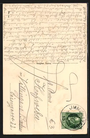 Personenbezogene Daten auf der Rückseite der Karte wurden durch blauen Textmarker unkenntlich gemacht. Die blauen Stellen sind auf die Vorderseite durchgeweicht und wirken sich negativ auf das Postkartenfoto aus