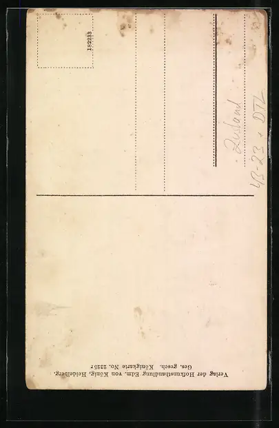 Personenbezogene Daten auf der Rückseite der Karte wurden durch blauen Textmarker unkenntlich gemacht. Die blauen Stellen sind auf die Vorderseite durchgeweicht und wirken sich negativ auf das Postkartenfoto aus