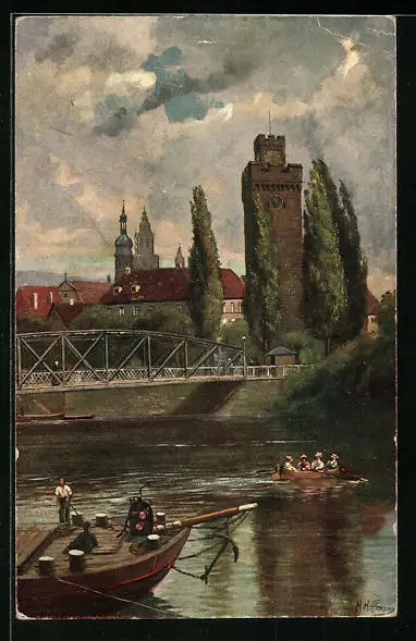 Künstler-AK Heilbronn a. N., Blick vom Neckar zum Götzenturm