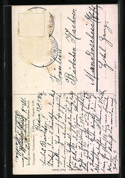 alte Ansichtskarte, gelaufen, Briefmarke entfernt, Oberflächenschaden, guter Zustand