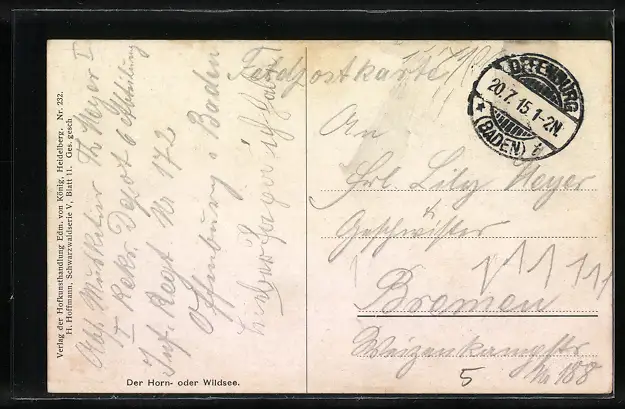 Personenbezogene Daten auf der Rückseite der Karte wurden durch blauen Textmarker unkenntlich gemacht. Die blauen Stellen sind auf die Vorderseite durchgeweicht und wirken sich negativ auf das Postkartenfoto aus