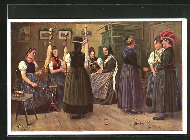 Künstler-AK Heinrich Hoffmann: Spinnstube im Schwarzwald
