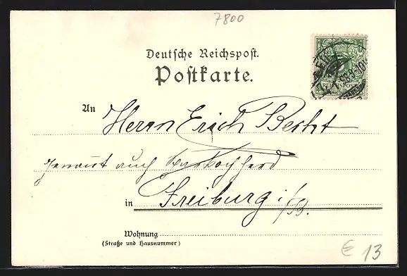 Personenbezogene Daten auf der Rückseite der Karte wurden durch blauen Textmarker unkenntlich gemacht. Die blauen Stellen sind auf die Vorderseite durchgeweicht und wirken sich negativ auf das Postkartenfoto aus