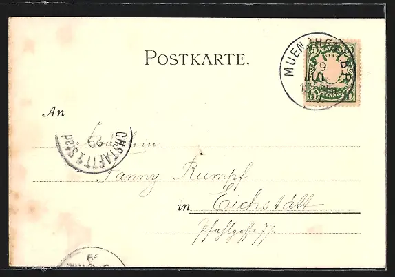 Personenbezogene Daten auf der Rückseite der Karte wurden durch blauen Textmarker unkenntlich gemacht. Die blauen Stellen sind auf die Vorderseite durchgeweicht und wirken sich negativ auf das Postkartenfoto aus