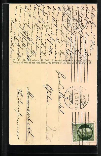 Personenbezogene Daten auf der Rückseite der Karte wurden durch blauen Textmarker unkenntlich gemacht. Die blauen Stellen sind auf die Vorderseite durchgeweicht und wirken sich negativ auf das Postkartenfoto aus
