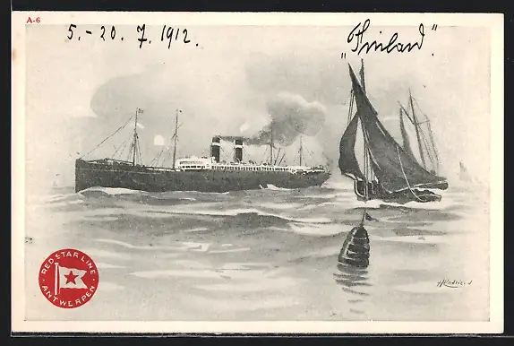 Künstler-AK Henri Cassiers: Red Star Line Antwerpen, Passagierschiff und Segler