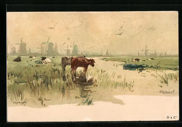 Künstler-AK Henri Cassiers: Weidende Rinder, Im Hintergrund Windmühlen
