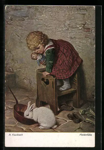 Künstler-AK Hermann Kaulbach: Hasenfüsse, Kleines Mädchen mit einem Hasen
