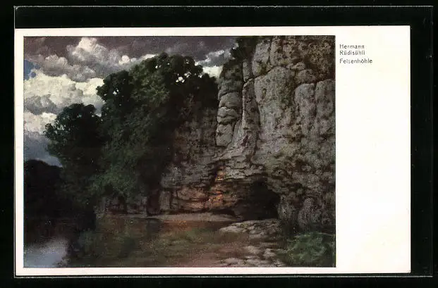 Künstler-AK Hermann Rüdisühli: Felsenhöhle an einem See