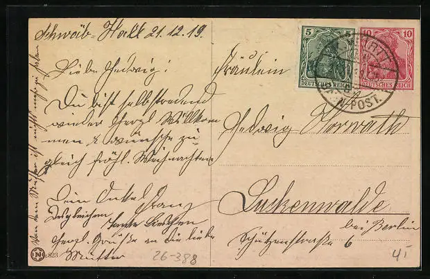 Personenbezogene Daten auf der Rückseite der Karte wurden durch blauen Textmarker unkenntlich gemacht. Die blauen Stellen sind auf die Vorderseite durchgeweicht und wirken sich negativ auf das Postkartenfoto aus
