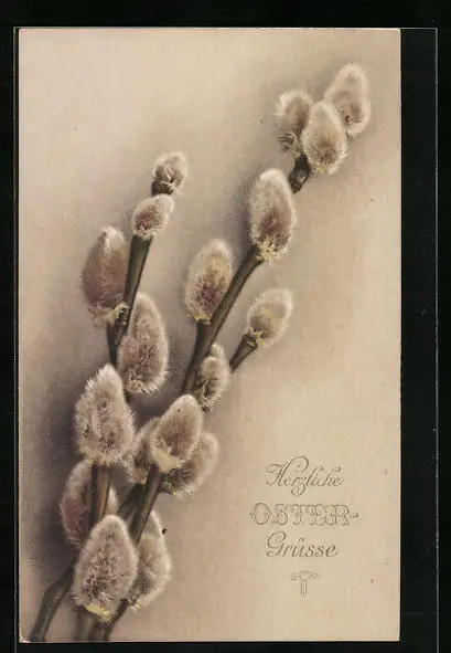 Künstler-AK Herzliche Ostergrüsse, Palmkätzchenzweige