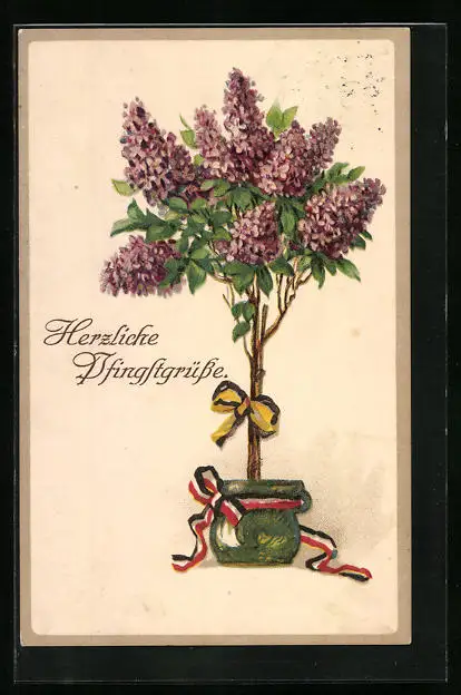 Künstler-AK Herzliche Pfingstgrüsse, Fliederstämmchen