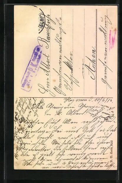 Personenbezogene Daten auf der Rückseite der Karte wurden durch blauen Textmarker unkenntlich gemacht. Die blauen Stellen sind auf die Vorderseite durchgeweicht und wirken sich negativ auf das Postkartenfoto aus