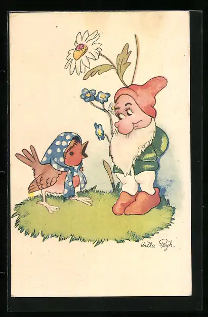 Künstler-AK Hilla Peyk: Zwerg bringt Rotkehlchen eine Blume