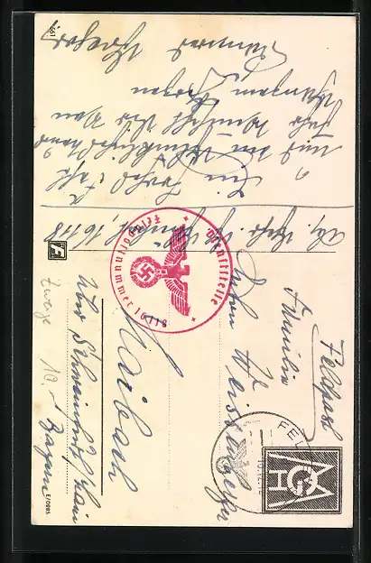 Personenbezogene Daten auf der Rückseite der Karte wurden durch blauen Textmarker unkenntlich gemacht. Die blauen Stellen sind auf die Vorderseite durchgeweicht und wirken sich negativ auf das Postkartenfoto aus