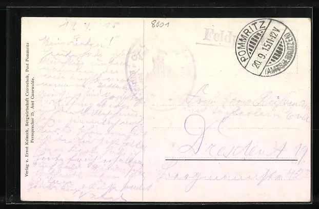 Personenbezogene Daten auf der Rückseite der Karte wurden durch blauen Textmarker unkenntlich gemacht. Die blauen Stellen sind auf die Vorderseite durchgeweicht und wirken sich negativ auf das Postkartenfoto aus