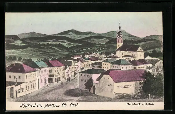 Künstler-AK Hofkirchen /Mühlkreis, Ortspartie aus der Vogelschau