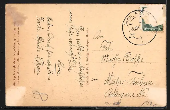 alte Ansichtskarte, gelaufen, Briefmarke entfernt, rückseitig Oberflächenschaden, rückseitig Klebe- und Papierreste, guter Zustand