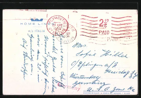 Künstler-AK Home Lines, das Passagierschiff M.S. Italia auf See
