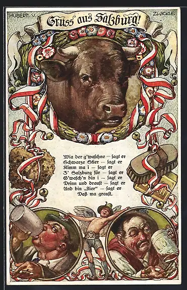 Künstler-AK Hubert von Zwickle: Salzburg, Biertrinker und Stierkopf