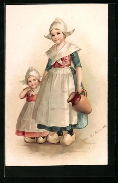 Künstler-AK Hübsche Holländerin mit ihrer kleinen Schwester