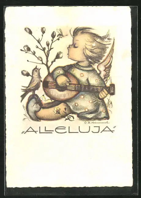 Künstler-AK Hummel: Engel mit Gitarre im Frühling