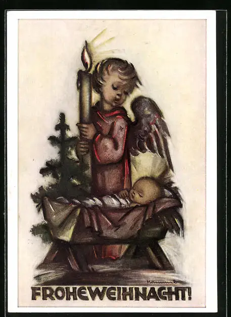 Künstler-AK Hummel: Engel mit Kerze beim Jesuskind an der Krippe