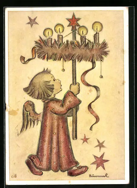 Künstler-AK Hummel: Engel mit Weihnachtskranz
